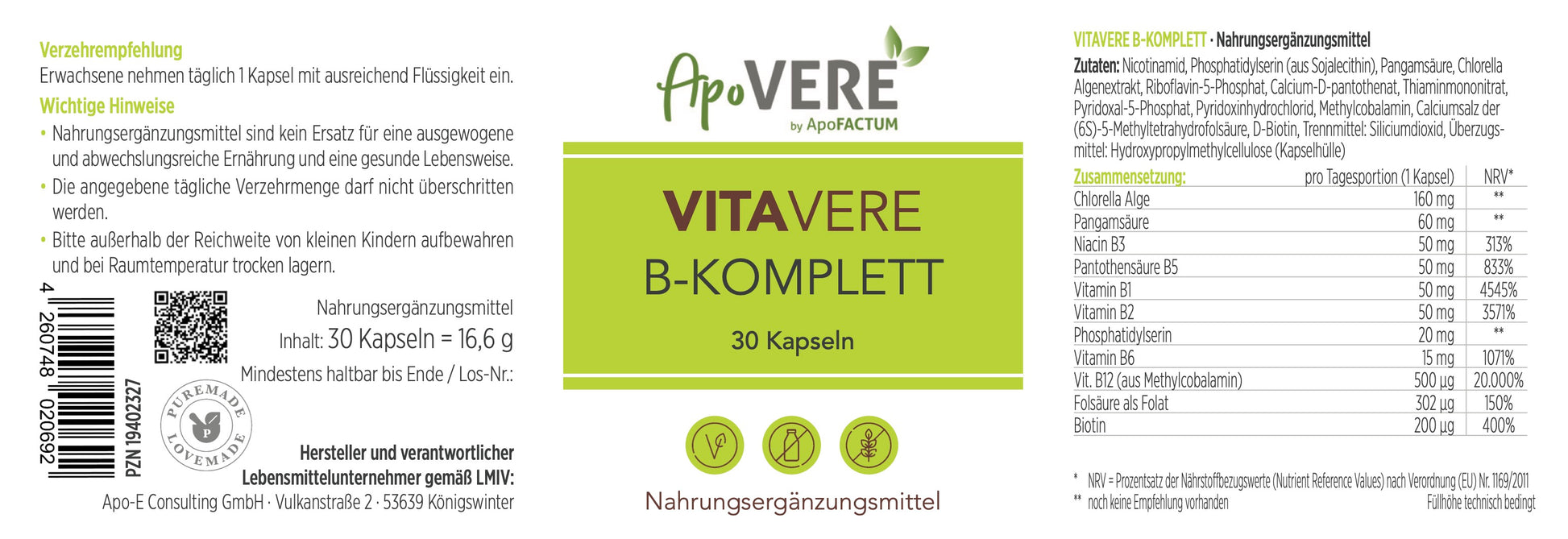 Das VITAVERE B-KOMPLETT von ApoVERE by ApoFACTUM ist ein hochwertiges Nahrungsergänzungsmittel, das eine umfassende Kombination wichtiger B-Vitamine und weiterer essenzieller Substanzen wie Phosphatidylserin, Chlorella Alge und Pangamsäure in nur einer Kapsel täglich liefert. Es wurde entwickelt, um die normale Funktion verschiedener Stoffwechselprozesse und des Nervensystems zu unterstützen und die Ernährung ideal zu ergänzen.