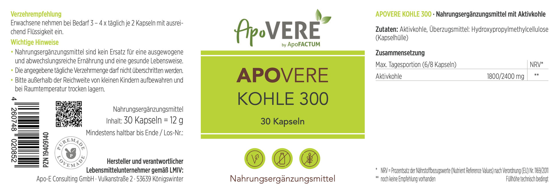 APOVERE KOHLE 300 ist ein hochwertiges Nahrungsergänzungsmittel mit Aktivkohle in praktischer Kapselform. Dieses Produkt, hergestellt von ApoFACTUM, ist darauf ausgelegt, flexibel und bedarfsorientiert eingenommen zu werden. Aktivkohle wird traditionell für ihre hohe Aufnahmefähigkeit geschätzt. Jede Kapsel ist mit 300 mg reinem Wirkstoff hochdosiert, was bei maximaler täglicher Verzehrmenge bis zu 2400 mg Aktivkohle liefert. APOVERE KOHLE 300 bietet eine unkomplizierte Möglichkeit, die Ernährung mit diesem speziellen Naturstoff zu ergänzen.
